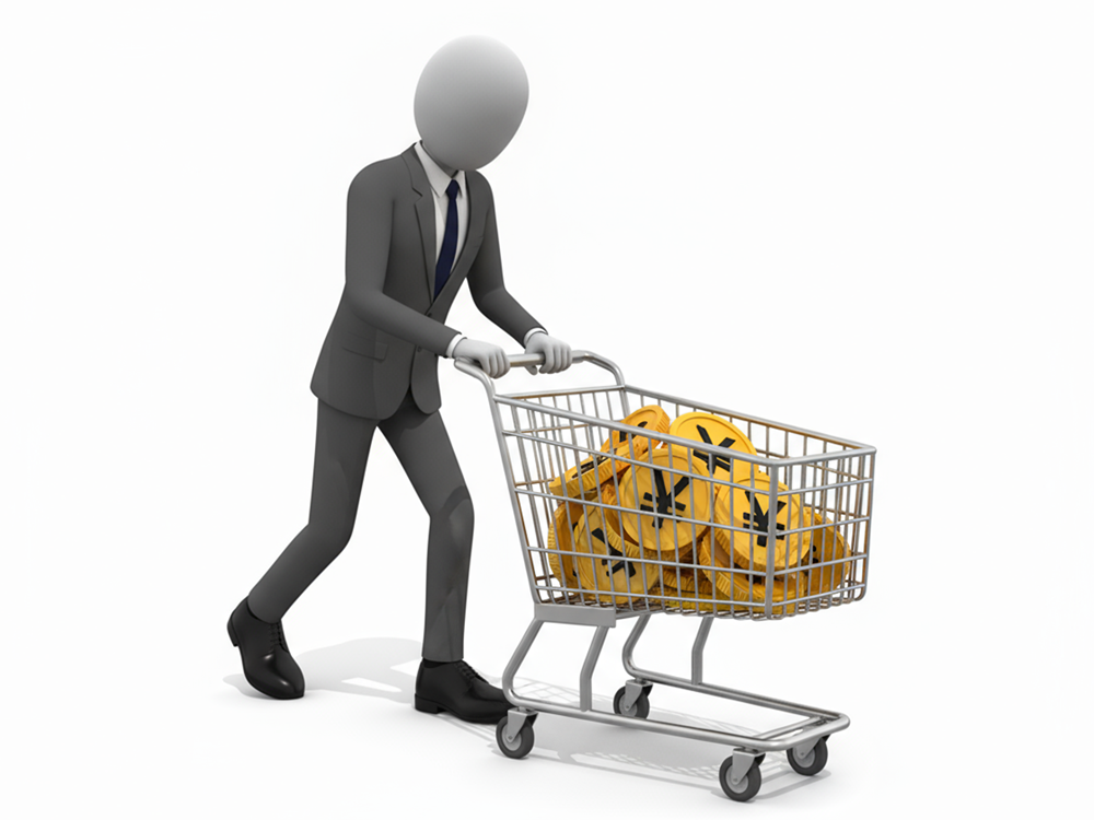 スーツ姿のビジネスパーソンが、スーパーマーケットにあるようなショッピングカートを押し、その中には日本円の「¥」マークが刻まれた金色のコインが溢れんばかりに積まれています。この人物イラストは、大きな買い物、設備投資、資金調達、資産運用、あるいは日本経済における旺盛な消費といった、お金がダイナミックに動く様子をコミカルに表現します。金融機関のウェブサイト、投資セミナーの案内、経済に関するニュース記事の挿絵などで幅広く活用できます。商用利用も可能なフリー素材ですので、日本のマーケットを対象としたビジネスコンテンツで、視覚的なアクセントとしてお使いいただける無料イラストです。