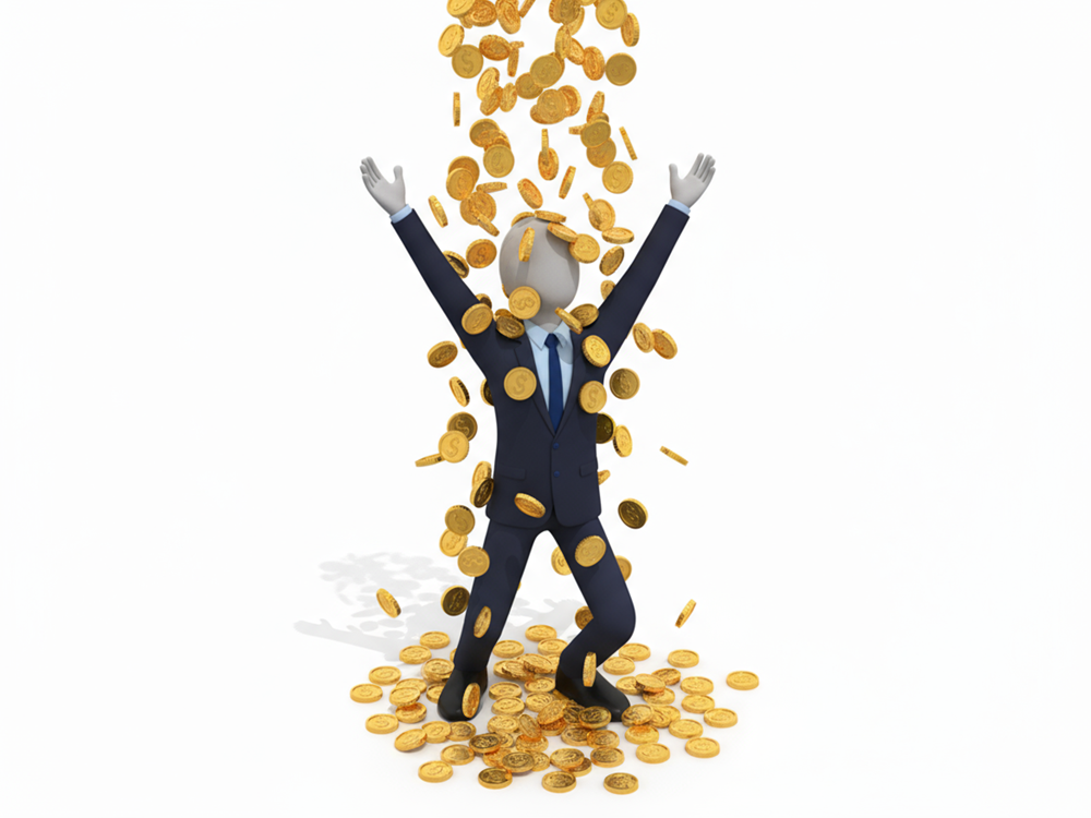 努力が実を結ぶ瞬間|大量のコインを浴びる人物の無料イラスト